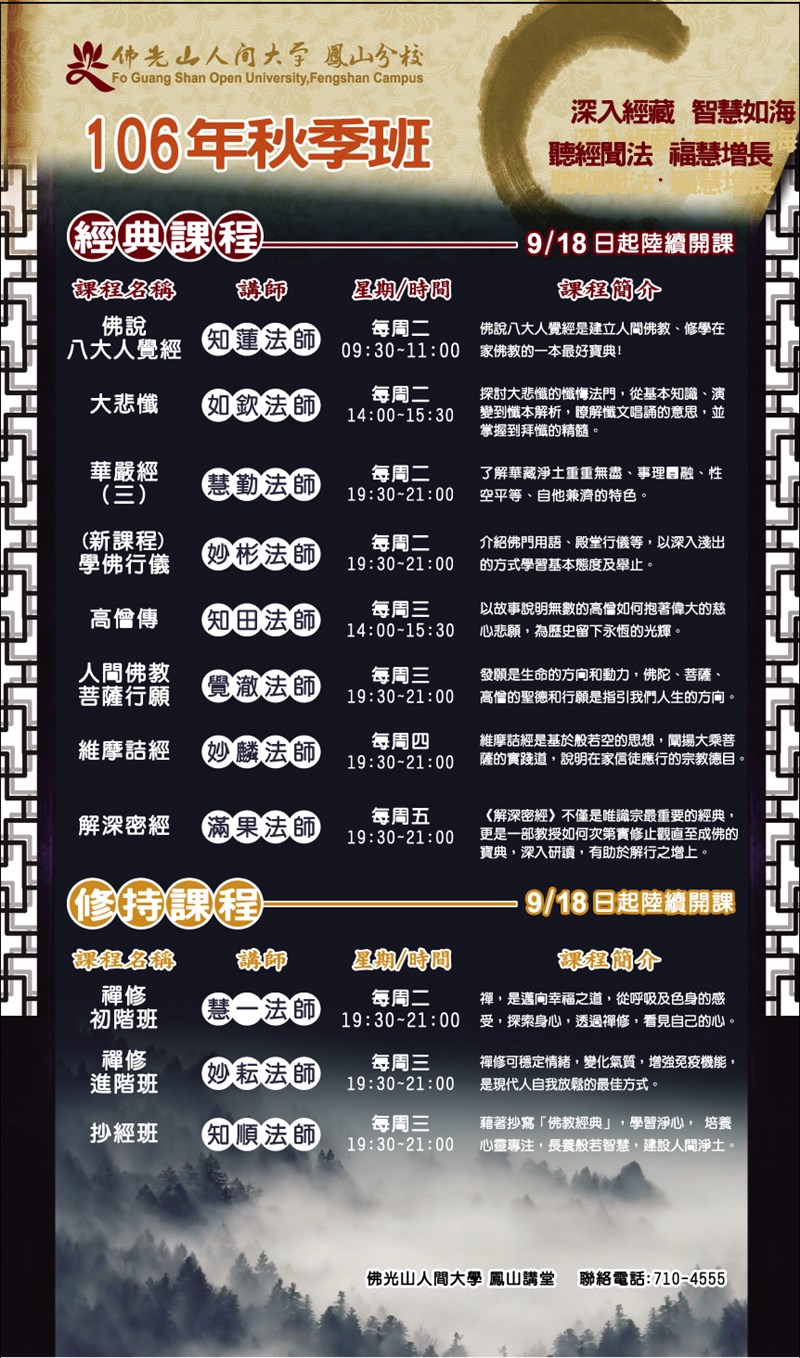 佛光山人間大學鳳山分校秋季班 |2017.09.06 語音朗讀 525觀看次 字級 大 中 小 佛光山人間大學鳳山分校秋季班 活動相關內容歡迎洽詢:07-7104-555 鳳山講堂社區大學 前一篇文章 2017星雲教育論壇 下一篇文章 如是我聞新品-佛光念佛機 熱門新聞 01故宮特展神獸再現 麒麟、鳳凰登場 2026.03.2402南華大學茶禪雅集 靜坐書寫時光膠囊2026.03.2603【詩】白花鬼2026.03.2504星雲大師靈骨分燈歐洲 傳燈萬方2026.03.2605佛光山365日越文版 贈西貢日航大酒店2026.03.2706紅綠葡萄抗氧化抗發炎 連皮吃獲取健康全效益2026.03.2707台灣工藝3專書 呈現文化獨特樣貌2026.03.2708星雲大師靈骨分燈北美 法脈永傳2026.03.2409中南部水庫水位告急 各地農損頻傳2026.03.2410兒童節禮物 新北學生自己票選2026.03.26 訂閱電子報 台北市 天氣預報 台灣一週天氣預報 相關報導 以文字護持人間福報運動睡眠新科技 養生保健新利器房仲第一品牌 永慶加薪3% 體驗美好手作 製皂幸福時光 博愛社大春季班招生中 薩克斯風吹奏春季班 人間大學台中分校招生中 跨越十年縱橫南半球到北半球 《行者》新書上市