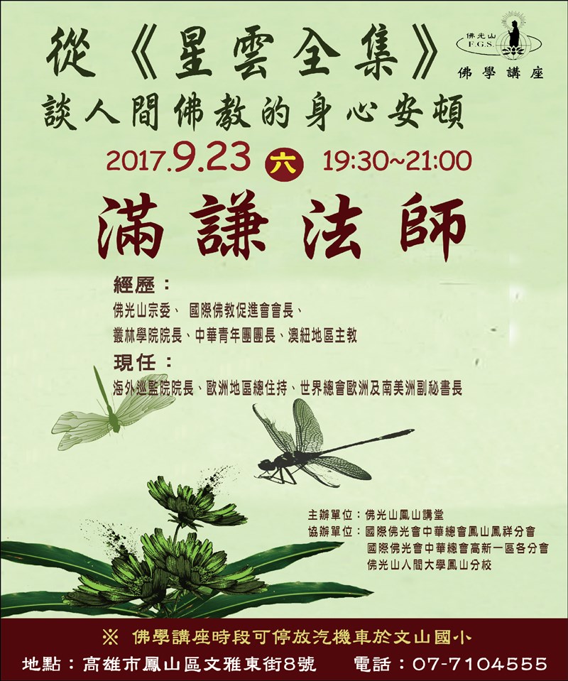 鳳山講堂佛學講座 |2017.09.07 語音朗讀 647觀看次 字級 大 中 小 鳳山講堂佛學講座 時間:2017年9月23日 地點:高雄市鳳山區文雅東街8號 電話:07-7104555 前一篇文章 福慧家園共修會福慧雙修 下一篇文章 三重禪淨佛學講座 熱門新聞 01故宮特展神獸再現 麒麟、鳳凰登場 2026.03.2402【詩】白花鬼2026.03.2503南華大學茶禪雅集 靜坐書寫時光膠囊2026.03.2604星雲大師靈骨分燈歐洲 傳燈萬方2026.03.2605佛光山365日越文版 贈西貢日航大酒店2026.03.2706星雲大師靈骨分燈北美 法脈永傳2026.03.2407中南部水庫水位告急 各地農損頻傳2026.03.2408台灣工藝3專書 呈現文化獨特樣貌2026.03.2709紅綠葡萄抗氧化抗發炎 連皮吃獲取健康全效益2026.03.2710兒童節禮物 新北學生自己票選2026.03.26 訂閱電子報 台北市 天氣預報 台灣一週天氣預報 相關報導 以文字護持人間福報運動睡眠新科技 養生保健新利器房仲第一品牌 永慶加薪3% 體驗美好手作 製皂幸福時光 博愛社大春季班招生中 薩克斯風吹奏春季班 人間大學台中分校招生中 跨越十年縱橫南半球到北半球 《行者》新書上市