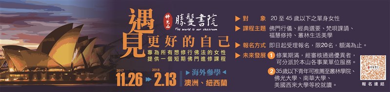 勝鬘書院 行腳雲遊世界 |2017.09.09 語音朗讀 458觀看次 字級 大 中 小 勝鬘書院 行腳雲遊世界 對象:20至45歲以下之單身女性,即日起受理報名。 前一篇文章 如是我聞新品-佛光念佛機 下一篇文章 9/16台北花博農民市集 熱門新聞 01鑲嵌藝術2026.03.2302【詩】白花鬼2026.03.2503故宮特展神獸再現 麒麟、鳳凰登場 2026.03.2404南華大學茶禪雅集 靜坐書寫時光膠囊2026.03.2605星雲大師靈骨分燈歐洲 傳燈萬方2026.03.2606楊筑云、林芷均 奧爾良羽賽獲亞軍2026.03.2307星雲大師靈骨分燈北美 法脈永傳2026.03.2408中南部水庫水位告急 各地農損頻傳2026.03.2409人間佛教聯合總會訪越南 弘法新契機2026.03.2310沉浸式共織宇宙 在新北美術館2026.03.23 訂閱電子報 台北市 天氣預報 台灣一週天氣預報 相關報導 以文字護持人間福報運動睡眠新科技 養生保健新利器房仲第一品牌 永慶加薪3% 體驗美好手作 製皂幸福時光 博愛社大春季班招生中 薩克斯風吹奏春季班 人間大學台中分校招生中 跨越十年縱橫南半球到北半球 《行者》新書上市