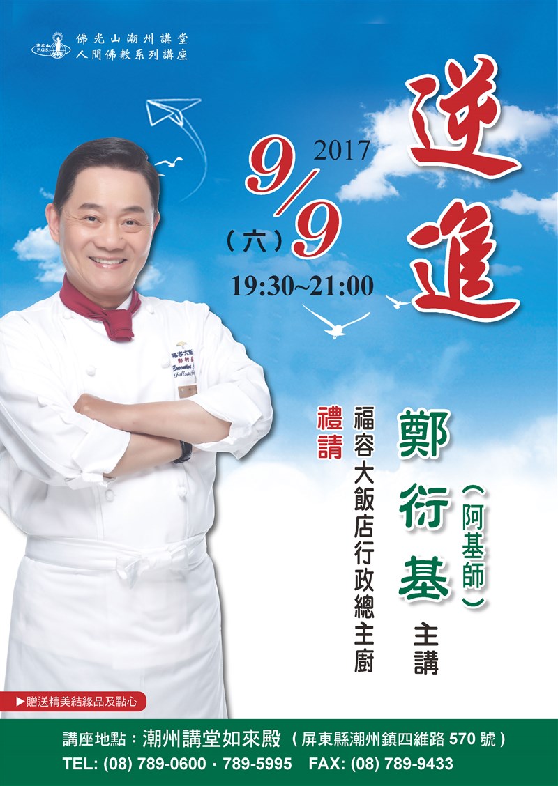 佛光山潮洲講堂系列講座 |2017.09.09 語音朗讀 467觀看次 字級 大 中 小 佛光山潮洲講堂系列講座 主講:鄭衍基(阿基師) 地點:屏東縣潮州鎮四維路570號 洽詢電話:08-789-9433 前一篇文章 台灣將軍黑豆系列禮盒 下一篇文章 2017國際書展暨蔬食博覽會-智慧之光曬經活動 熱門新聞 01南投太極美地空中纜車 下半年動工2026.03.2202【轉角風景】幽靜觀賞 三色寒櫻2026.03.2203【詩】白花鬼2026.03.2504鑲嵌藝術2026.03.2305故宮特展神獸再現 麒麟、鳳凰登場 2026.03.2406南華大學茶禪雅集 靜坐書寫時光膠囊2026.03.2607楊筑云、林芷均 奧爾良羽賽獲亞軍2026.03.2308星雲大師靈骨分燈北美 法脈永傳2026.03.2409中南部水庫水位告急 各地農損頻傳2026.03.2410星雲大師靈骨分燈歐洲 傳燈萬方2026.03.26 訂閱電子報 台北市 天氣預報 台灣一週天氣預報 相關報導 以文字護持人間福報運動睡眠新科技 養生保健新利器房仲第一品牌 永慶加薪3% 體驗美好手作 製皂幸福時光 博愛社大春季班招生中 薩克斯風吹奏春季班 人間大學台中分校招生中 跨越十年縱橫南半球到北半球 《行者》新書上市