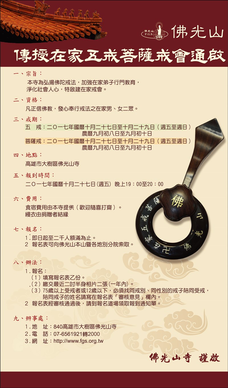 2017年佛光山在家五戒菩薩戒會通啟 |2017.09.11 語音朗讀 819觀看次 字級 大 中 小 2017年佛光山在家五戒菩薩戒會通啟 戒期:2017年10月27日至10月29日(週五至週日) 地點:高雄市大樹區佛光山寺 報到時間:2017年10月27日(週五)晚上19:00至20:00 報名時間:即日起至二千人額滿為止。 報名洽詢電話:07-6561921轉2000 網址:http://www.fgs.org.tw 前一篇文章 《禪心料理》熱銷中 下一篇文章 福慧家園共修會 福慧雙修 熱門新聞 01HBL周末總決賽 8校燃戰火 2026.03.2002返鄉火車擠爆2026.03.2003中南部大旱 高雄3月已73件山林火警 2026.03.2104星雲大師靈骨 12道場迎奉法燈遠傳2026.03.2005新北市美術館 共織宇宙特展2026.03.2006珍寶入地宮 法華經奉納佛光大佛2026.03.2107【美好生活】酸澀 蔓越莓 烤出 幸福甜2026.03.2008人間佛教聯合總會訪越南 弘法新契機2026.03.2309研讀星雲大師人間佛教傳燈錄 永續傳承智慧2026.03.2110「基隆三炷香」將拆 獲提報歷史建築2026.03.20 訂閱電子報 台北市 天氣預報 台灣一週天氣預報 相關報導 以文字護持人間福報運動睡眠新科技 養生保健新利器房仲第一品牌 永慶加薪3% 體驗美好手作 製皂幸福時光 博愛社大春季班招生中 薩克斯風吹奏春季班 人間大學台中分校招生中 跨越十年縱橫南半球到北半球 《行者》新書上市