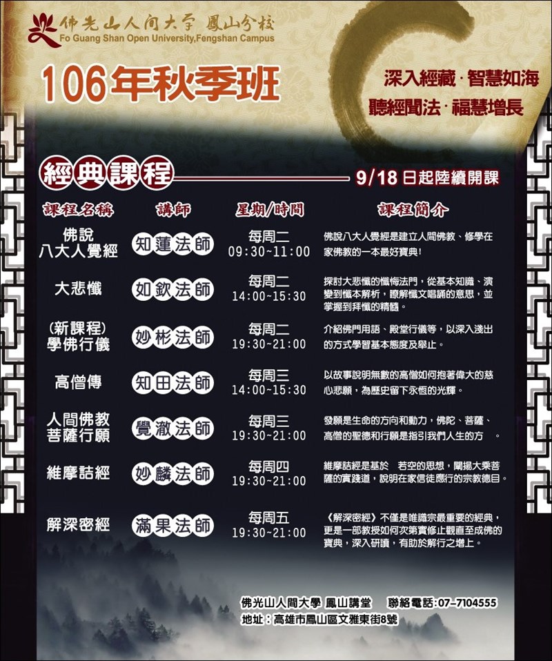 佛光山人間大學 鳳山分校經典課程 |2017.09.12 語音朗讀 2409觀看次 字級 大 中 小 佛光山人間大學 鳳山分校經典課程 深入經藏 智慧如海 聽經聞法 福慧增長 詳情洽詢:07-710-4555 地址:高雄市鳳山區雅文東街8號 前一篇文章 2017星雲教育論壇-中區場 下一篇文章 香海文化《金剛經的理論與修行法門》 熱門新聞 01HBL周末總決賽 8校燃戰火 2026.03.2002川普估習川會 5或6周內舉行2026.03.1903澳洲南天寺 南半球續法燈 人間佛教落地生根2026.03.1904【島嶼拼圖】時光站牌2026.03.1905佛光祖庭宜興大覺寺 佛法薪傳歸故里 悲願光照人間2026.03.1906美海軍引進機器人 爬牆維修艦艇2026.03.1907返鄉火車擠爆2026.03.2008【詩】蠟蟬說禪2026.03.1909中南部大旱 高雄3月已73件山林火警 2026.03.2110佛光大學 語文、歷史學系全部滿招2026.03.19 訂閱電子報 台北市 天氣預報 台灣一週天氣預報 相關報導 以文字護持人間福報運動睡眠新科技 養生保健新利器房仲第一品牌 永慶加薪3% 體驗美好手作 製皂幸福時光 博愛社大春季班招生中 薩克斯風吹奏春季班 人間大學台中分校招生中 跨越十年縱橫南半球到北半球 《行者》新書上市