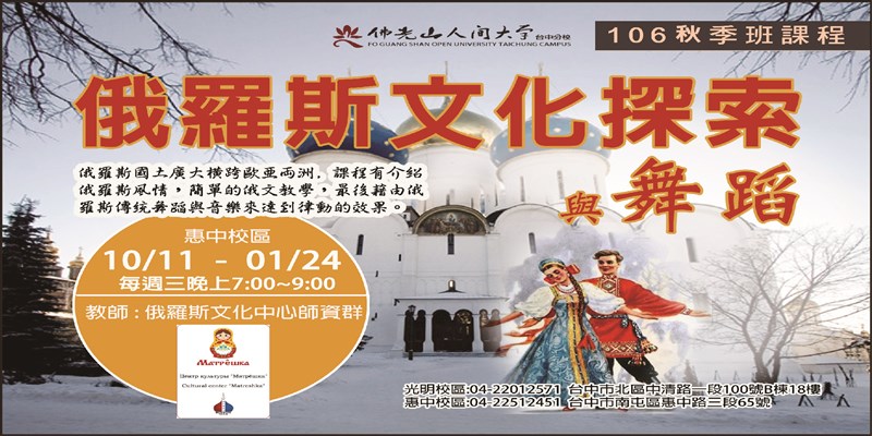 本課程由在台多年的俄羅斯人教授,除了介紹俄羅斯的風俗民情外,還有簡單的俄文教學,最後帶入當地的傳統民俗舞蹈,一起歡樂一下。