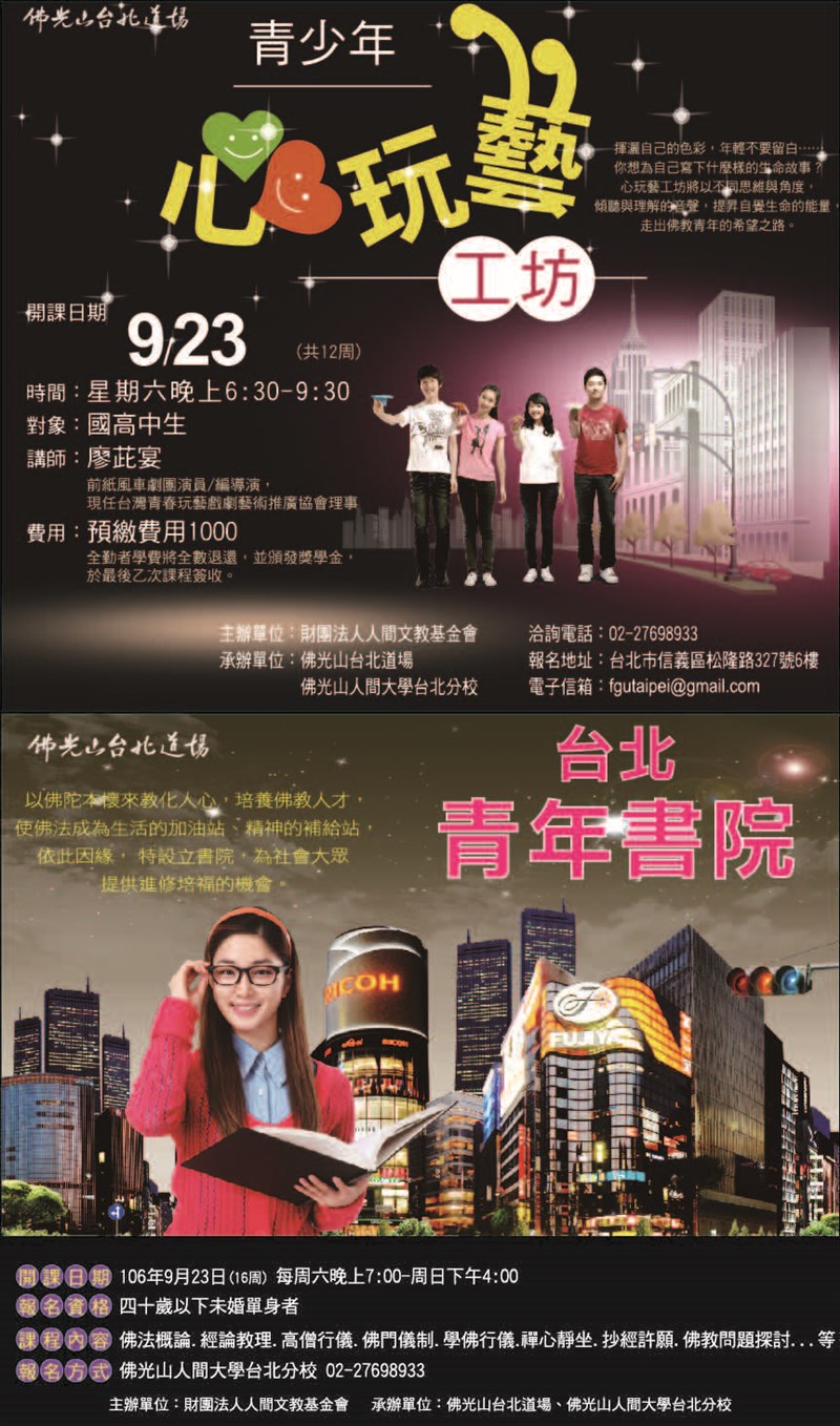 台北道場社教課 |2017.09.15 語音朗讀 1306觀看次 字級 大 中 小 台北道場社教課 課程:青少年心玩藝工坊 時間:星期六晚上6:30-9:12 共12週 報名資格:國高中生 課程:台北青年書院 時間:星期六晚上7:00-週日下午4:00 共16週 報名資格:四十歲以下未婚單身者 報名電話:02-2769-8933 佛光山台北道場 佛光人間大學台北分校 報名地址:台北市信義區松隆路327號6樓 電子信箱:fgutaipei@gmail.com 前一篇文章 金蘭甘露醬油180天恆溫釀造 下一篇文章 索取《人間佛教學報‧藝文》 熱門新聞 01銀杏點亮.東京印象2025.12.2302北捷英雄捨身救人 母盼菩薩接引2025.12.2303【守護家人】 為愛築家2025.12.2304【獻給動物朋友的詩】 最可愛的動物詩路2025.12.2505降噪耳機原理2025.12.2206數位科技與信仰交會 推播人間佛教文化2025.12.2207以法相聚 佛光山員義工歲末聯誼2025.12.2408冬季騎遇 大鵬灣蔬旅2025.12.2209全球首創 二氧化碳發電機2025.12.2210社論--悲憐天下父母心2025.12.25 訂閱電子報 台北市 天氣預報 台灣一週天氣預報 相關報導 以文字護持人間福報運動睡眠新科技 養生保健新利器房仲第一品牌 永慶加薪3% 體驗美好手作 製皂幸福時光 博愛社大春季班招生中 薩克斯風吹奏春季班 人間大學台中分校招生中 跨越十年縱橫南半球到北半球 《行者》新書上市
