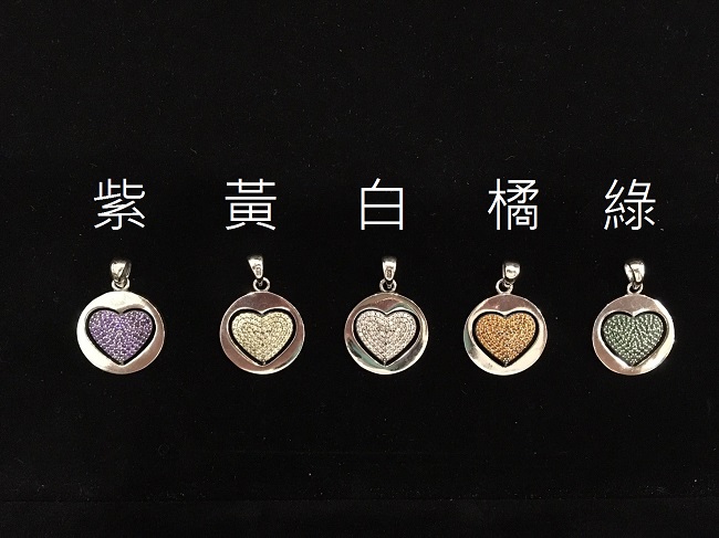 以A 925純銀打造而成的鋯石項鍊組,手工打造墜飾皆隨機搭配一條純銀鍊子,每個心型皆是用密釘鑲的方式鑲嵌了100多顆的鋯石,共有五種顏色可供選擇,墜飾中間心型可翻轉,又稱翻轉幸福。