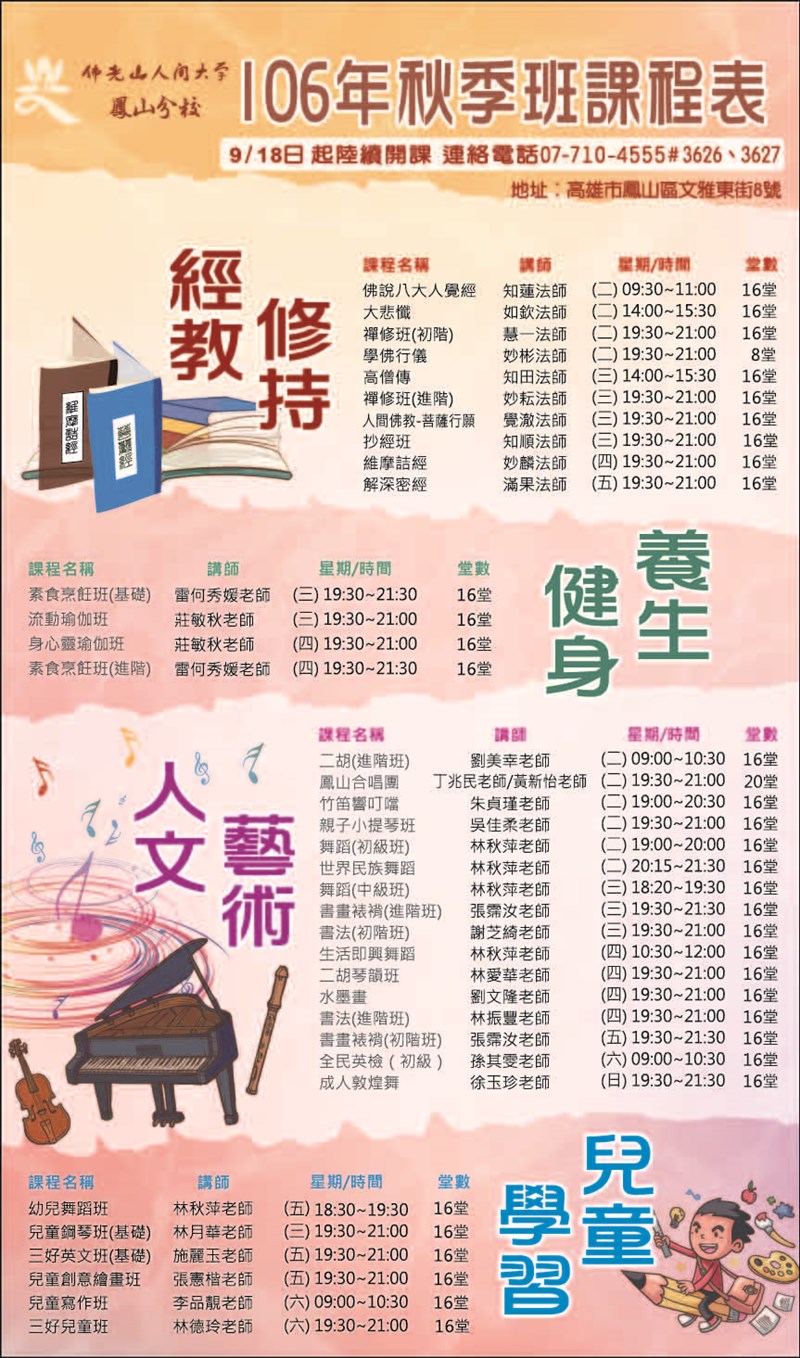 佛光山人間大學秋季班課程 |2017.09.19 語音朗讀 670觀看次 字級 大 中 小 佛光山人間大學秋季班課程 精教修持、養生健身、人文藝術、兒童學習等精彩豐富課程,歡迎踴躍報名參加。 洽詢專線:07-710-4555分機3626、3627 地址:高雄市鳳山區文雅東街8號 前一篇文章 金蘭甘露醬油180天恆溫釀造 下一篇文章 佛光山員林講堂2017年「名聲天曉」佛學講座 熱門新聞 01與精品品牌撞鞋 印度涼鞋打專利戰2025.12.2102銀杏點亮.東京印象2025.12.2303邂逅佛教 安頓身心2025.12.2104【動物奧斯卡獎】猜猜誰最會演(上)2025.12.2105北捷英雄捨身救人 母盼菩薩接引2025.12.2306【守護家人】 為愛築家2025.12.2307【佛教管理學②】人間佛教的「治心十法」⑩2025.12.2108社論--瞋恨的危害2025.12.2109降噪耳機原理2025.12.2210數位科技與信仰交會 推播人間佛教文化2025.12.22 訂閱電子報 台北市 天氣預報 台灣一週天氣預報 相關報導 以文字護持人間福報運動睡眠新科技 養生保健新利器房仲第一品牌 永慶加薪3% 體驗美好手作 製皂幸福時光 博愛社大春季班招生中 薩克斯風吹奏春季班 人間大學台中分校招生中 跨越十年縱橫南半球到北半球 《行者》新書上市