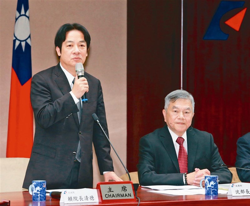 行政院長賴清德(左)昨天率行政院副院長等行政團隊前往經濟部,聽取經濟部長沈榮津(右)、次長及所屬工業局、能源局、水利署、台水、台電、投資處等單位代表,就產業五缺的情形及因應對策簡報,並主持「五缺」問題會議。圖/黃義書