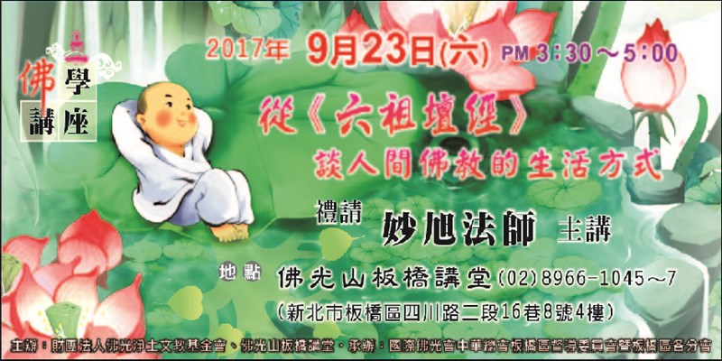 板橋講堂佛學講座 |2017.09.22 語音朗讀 646觀看次 字級 大 中 小 板橋講堂佛學講座 禮請妙旭法師主講 時間:2017年9月23日下午3:30~5:00 地點:佛光山板橋講堂 地址:新北市板橋區四川路二段16巷8號4樓 洽詢電話:02-8966-1045~7 前一篇文章 佛光山叢林學院 短期佛學院招生 下一篇文章 好醬油.就是黑龍蔭油 熱門新聞 01與精品品牌撞鞋 印度涼鞋打專利戰2025.12.2102佛光山高雄佛教堂 營建工地評鑑特優2025.12.1903銀杏點亮.東京印象2025.12.2304太陽瓶燈泡 點亮貧困家庭希望 2025.12.1905邂逅佛教 安頓身心2025.12.2106【動物奧斯卡獎】猜猜誰最會演(上)2025.12.2107【時光重逢】花宅海邊美術館2025.12.1908北島佛光山獲四星肯定 園林躍升具重要意義庭園2025.12.1909日球星率道奇連霸 2025體壇最驚奇 2025.12.1910社論--瞋恨的危害2025.12.21 訂閱電子報 台北市 天氣預報 台灣一週天氣預報 相關報導 以文字護持人間福報運動睡眠新科技 養生保健新利器房仲第一品牌 永慶加薪3% 體驗美好手作 製皂幸福時光 博愛社大春季班招生中 薩克斯風吹奏春季班 人間大學台中分校招生中 跨越十年縱橫南半球到北半球 《行者》新書上市