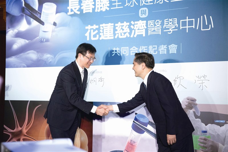 花蓮慈濟醫院院長林欣榮(右)與長春藤全球健康生物科技董事長陳炯瑜,同台宣告合作計畫。圖/長春藤幹細胞保存庫提供