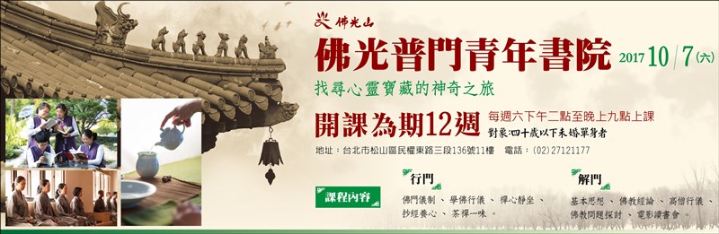 普門青年書院 |2017.09.27 語音朗讀 770觀看次 字級 大 中 小 普門青年書院 2017年10月7日星期六,開課為期12週。 每週六下午二點至晚上九點上課,歡迎四十歲以下未婚單身者報名。 地址:台北市松山區民權東街三段136號11樓 電話:02-2712-1177 前一篇文章 菩提眷屬 佛化婚禮 下一篇文章 勝鬘書院 行腳雲遊世界 熱門新聞 01【詩】草螟公2025.12.1802與精品品牌撞鞋 印度涼鞋打專利戰2025.12.2103福建艦航經台海 空拍照首曝光2025.12.1804資助流浪漢之家 里斯本佛光人跨文化送暖2025.12.1805多倫多佛光山龍獅團 中華文化薪火相傳2025.12.1806佛光山高雄佛教堂 營建工地評鑑特優2025.12.1907【時光重逢】花宅海邊美術館2025.12.1908邂逅佛教 安頓身心2025.12.2109北島佛光山獲四星肯定 園林躍升具重要意義庭園2025.12.1910太陽瓶燈泡 點亮貧困家庭希望 2025.12.19 訂閱電子報 台北市 天氣預報 台灣一週天氣預報 相關報導 以文字護持人間福報運動睡眠新科技 養生保健新利器房仲第一品牌 永慶加薪3% 體驗美好手作 製皂幸福時光 博愛社大春季班招生中 薩克斯風吹奏春季班 人間大學台中分校招生中 跨越十年縱橫南半球到北半球 《行者》新書上市