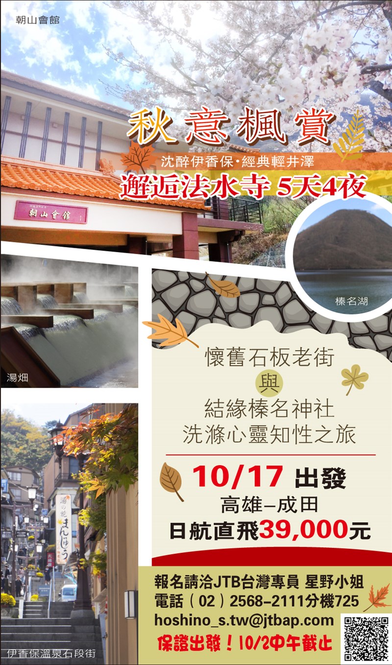 由法水寺及日本最大旅行社JTB集團共同合作,「秋意楓賞 沈醉伊香保・經典輕井澤・邂逅法水寺 5天4夜」,將於10月17日高雄出發,特別安排法水寺參拜以及三晚溫泉飯店,歡迎台灣民眾來體驗,群馬古今文化及歷史絕景。行程規劃由高雄-東京成田日航直飛航班,費用包含小費。