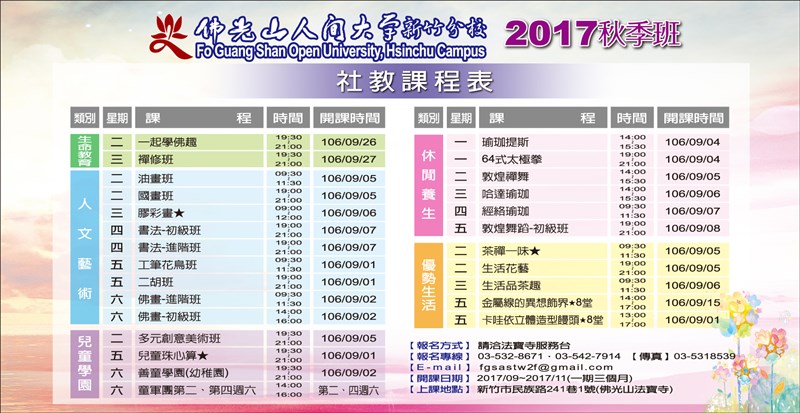 佛光山人間大學 新竹分社社教課程 |2017.10.03 語音朗讀 1584觀看次 字級 大 中 小 佛光山人間大學 新竹分社社教課程 即日起受理報名 報名方式:請洽法寶寺服務台 報名專線:03-352-8671、03-542-7914 (傳真)03-531-8539 Email:fgsastw2f@gamil.com 開課日期:2017/09~2017/11(一期三個月) 上課地點:新竹市民族路241巷1號(佛光山法寶寺) 前一篇文章 恭賀人間衛視榮獲 我愛歡喜優質動畫獎 下一篇文章 勝鬘書院 行腳雲遊世界 熱門新聞 01【詩】草螟公2025.12.1802【閃文集】火星暗斑之謎2025.12.1603如何優雅不濺水花?2025.12.1604福建艦航經台海 空拍照首曝光2025.12.1805高雄新航線明啟動 佛光山成亮點2025.12.1706寶塔寺 三代同堂搓湯圓、繪燈籠2025.12.1607受星雲大師啟發 旅日名廚獲頒黃綬褒章2025.12.1608資助流浪漢之家 里斯本佛光人跨文化送暖2025.12.1809社論--改變與改變的能力2025.12.1610多倫多佛光山龍獅團 中華文化薪火相傳2025.12.18 訂閱電子報 台北市 天氣預報 台灣一週天氣預報 相關報導 以文字護持人間福報運動睡眠新科技 養生保健新利器房仲第一品牌 永慶加薪3% 體驗美好手作 製皂幸福時光 博愛社大春季班招生中 薩克斯風吹奏春季班 人間大學台中分校招生中 跨越十年縱橫南半球到北半球 《行者》新書上市