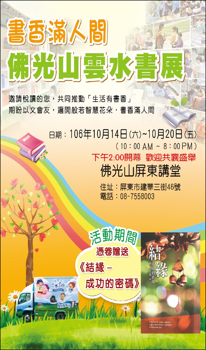 書香滿人間 佛光山雲水書展 |2017.10.14 語音朗讀 452觀看次 字級 大 中 小 書香滿人間 佛光山雲水書展 日期:106年10月14日(六)~10月20日(五) 早上10點至晚上8點 10月14日下午2點開幕 歡迎共襄盛舉 地點:佛光山屏東講堂 住址:屏東市建華三街46號 電話:08-755-8003 活動期間,憑卷贈送《結緣-成功的密碼》書籍 前一篇文章 2017國際書展暨蔬食博覽會 下一篇文章 星雲大師全集助印名錄 熱門新聞 01多元計程車機場載客 高雄先試辦2026.03.1102台灣燈會 法國「飛天白馬秀」演到14日2026.03.1103中東戰火 國際油價飆破 100 美元2026.03.1004記星雲大師二三事2026.03.1005【閱讀生活】明天會更好2026.03.1006佛光山花蓮光復佛光緣 灑淨啟用2026.03.1007【小書法家】攏馬歡喜2026.03.1008星雲大師全集【傳記】 百年佛緣─社緣篇 讓體育在佛教生根 3 - 12026.03.1009多晒太陽多活動 長輩不失眠2026.03.1010千名愛書人 共讀中國佛教文學史2026.03.10 訂閱電子報 台北市 天氣預報 台灣一週天氣預報 相關報導 以文字護持人間福報運動睡眠新科技 養生保健新利器房仲第一品牌 永慶加薪3% 體驗美好手作 製皂幸福時光 博愛社大春季班招生中 薩克斯風吹奏春季班 人間大學台中分校招生中 跨越十年縱橫南半球到北半球 《行者》新書上市