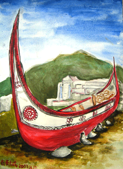 畫面中的大大的拼板舟,占了畫面很大的空間,主題很明顯,所以這艘船當然就要表現的很好囉!紅色的船身,白底和黑色圖案的搭配,使得拼板舟十分顯眼。利用透視的技巧,舟體本身前大後小的畫法,讓主題看起來更加有氣勢。背景選用綠色和藍色等寒色系色彩,對比的手法,可以將主題烘托的更完美。