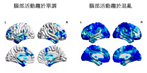 思覺失調症患者腦部活動:左圖腦部活動單調,易產生幻覺;右圖腦部活動混亂,易使認知功能退化。 圖/台北榮總提供