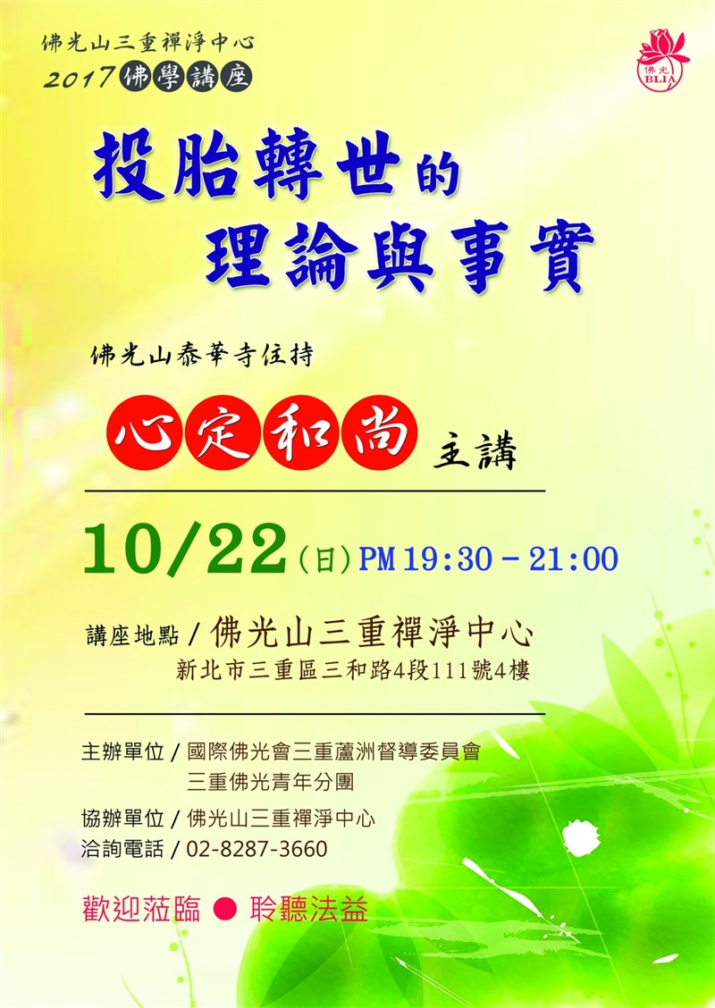 佛光山三重禪淨中心 2017年佛學講座 |2017.10.20 語音朗讀 2239觀看次 字級 大 中 小 佛光山三重禪淨中心 2017年佛學講座 時間:2017年10月22日(星期日)晚上7:30-9:00 地點:佛光山三重禪淨中心(新北市三重區三和路4段111號4樓) 歡迎蒞臨 聆聽法益 洽詢電話:02-8287-3660 前一篇文章 佛光山小港講堂《幸福與安樂系列講座》 下一篇文章 全國農村再生市集in台北活動 熱門新聞 01【分享時刻】梨木小提燈2026.03.1302福島核電廠員工 15年救千隻浪浪2026.03.1203法寶贈南天大學 學術信仰新對話2026.03.1304佛光山蓮華寺新春慶典 獲美國會頒獎2026.03.1305杭州戲院新規 看到爛片可退款2026.03.1206搞懂發酵、發霉、 腐敗差在哪裡!2026.03.1307佛教友誼獎學金研習 青年涵養正知正見2026.03.1308【快樂塗鴉簿】直排輪比賽2026.03.1209退休後練跑步 82歲翁逆轉生理年齡2026.03.1210尿酸高 傷腎訊號2026.03.12 訂閱電子報 台北市 天氣預報 台灣一週天氣預報 相關報導 以文字護持人間福報運動睡眠新科技 養生保健新利器房仲第一品牌 永慶加薪3% 體驗美好手作 製皂幸福時光 博愛社大春季班招生中 薩克斯風吹奏春季班 人間大學台中分校招生中 跨越十年縱橫南半球到北半球 《行者》新書上市