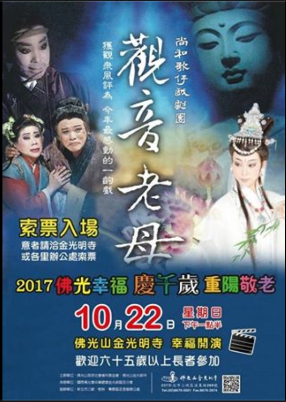 佛光山金光明寺舉辦2017佛光幸福慶千歲,重陽敬老節系列活動,10月22日星期日下午一點半於金光明寺隆重豋場。獲觀眾風評今年度最感動人心的歌仔戲《觀音老母》邀請知名和尚歌仔戲劇團熱力開演。