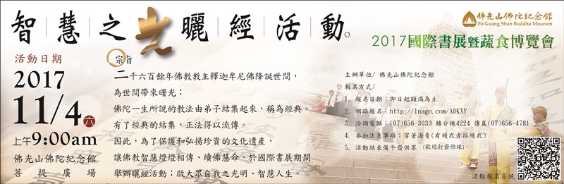 2017國際書展暨蔬食博覽會-智慧之光曬經活動 |2017.10.22 語音朗讀 234觀看次 字級 大 中 小 2017國際書展暨蔬食博覽會-智慧之光曬經活動 活動日期:2017年11月4日上午9點 活動地點:佛光山佛陀紀念館 菩提廣場 前一篇文章 三創產業聯合嘉年華活動 下一篇文章 佛光山妙法寺百萬人興學行腳托缽 熱門新聞 01【分享時刻】梨木小提燈2026.03.1302福島核電廠員工 15年救千隻浪浪2026.03.1203杭州戲院新規 看到爛片可退款2026.03.1204搞懂發酵、發霉、 腐敗差在哪裡!2026.03.1305法寶贈南天大學 學術信仰新對話2026.03.1306星雲大師全集【傳記】 百年佛緣─社緣篇 素齋談禪的意義(節錄)2026.03.1307義大利成黑馬 經典賽8強出爐2026.03.1308【快樂塗鴉簿】直排輪比賽2026.03.1209聯合國CSW70 佛光山關注婦女權益 2026.03.1210佛光山蓮華寺新春慶典 獲美國會頒獎2026.03.13 訂閱電子報 台北市 天氣預報 台灣一週天氣預報 相關報導 以文字護持人間福報運動睡眠新科技 養生保健新利器房仲第一品牌 永慶加薪3% 體驗美好手作 製皂幸福時光 博愛社大春季班招生中 薩克斯風吹奏春季班 人間大學台中分校招生中 跨越十年縱橫南半球到北半球 《行者》新書上市