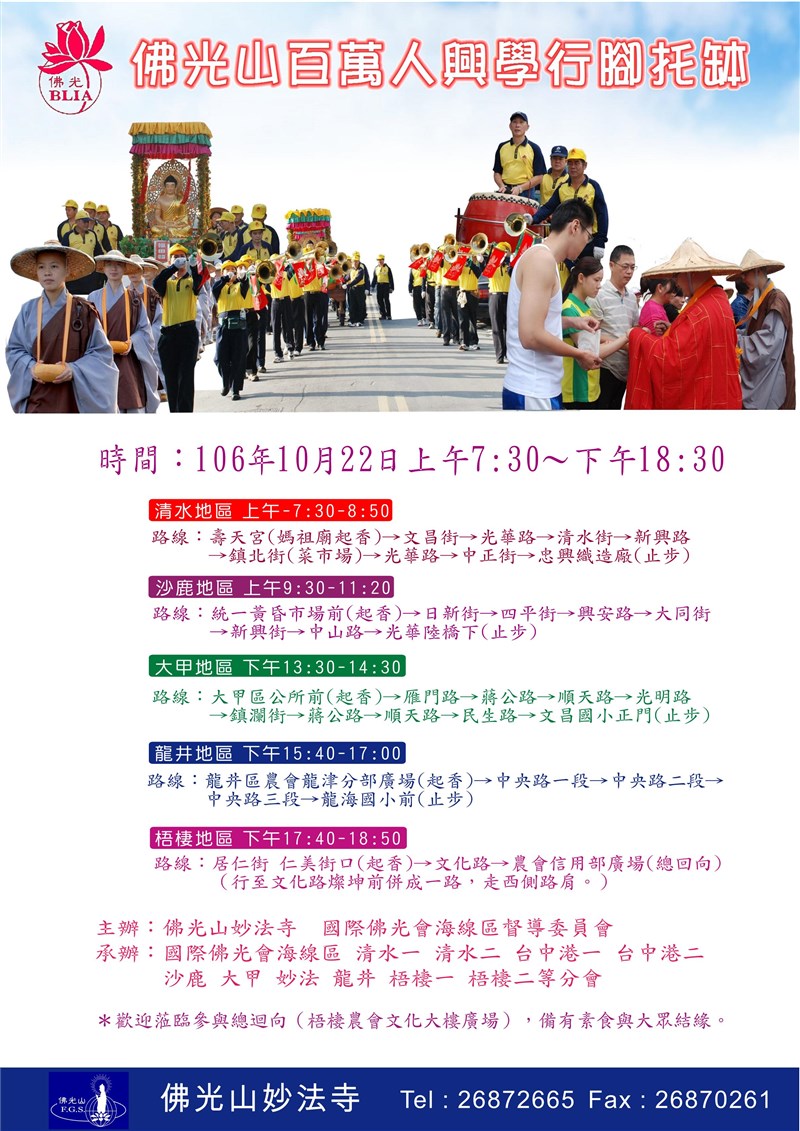 佛光山妙法寺百萬人興學行腳托缽 |2017.10.22 語音朗讀 814觀看次 字級 大 中 小 佛光山妙法寺百萬人興學行腳托缽 10月22日佛光山妙法寺百萬人興學行腳托缽活動,將於早上7點30分於台中清水區壽天宮起程,經沙鹿、大甲、龍井,於梧棲農會信用總部總迴向,現場備有素食與大眾結緣,歡迎參與蒞臨,共同護持百萬人興學,為教育盡一份心力! 佛光山妙法寺洽詢電話:02-2687-2665 前一篇文章 2017國際書展暨蔬食博覽會-智慧之光曬經活動 下一篇文章 佛光山叢林學院 專修部 短期佛學院招生 熱門新聞 01【分享時刻】梨木小提燈2026.03.1302福島核電廠員工 15年救千隻浪浪2026.03.1203杭州戲院新規 看到爛片可退款2026.03.1204搞懂發酵、發霉、 腐敗差在哪裡!2026.03.1305法寶贈南天大學 學術信仰新對話2026.03.1306星雲大師全集【傳記】 百年佛緣─社緣篇 素齋談禪的意義(節錄)2026.03.1307義大利成黑馬 經典賽8強出爐2026.03.1308【快樂塗鴉簿】直排輪比賽2026.03.1209聯合國CSW70 佛光山關注婦女權益 2026.03.1210佛光山蓮華寺新春慶典 獲美國會頒獎2026.03.13 訂閱電子報 台北市 天氣預報 台灣一週天氣預報 相關報導 以文字護持人間福報運動睡眠新科技 養生保健新利器房仲第一品牌 永慶加薪3% 體驗美好手作 製皂幸福時光 博愛社大春季班招生中 薩克斯風吹奏春季班 人間大學台中分校招生中 跨越十年縱橫南半球到北半球 《行者》新書上市