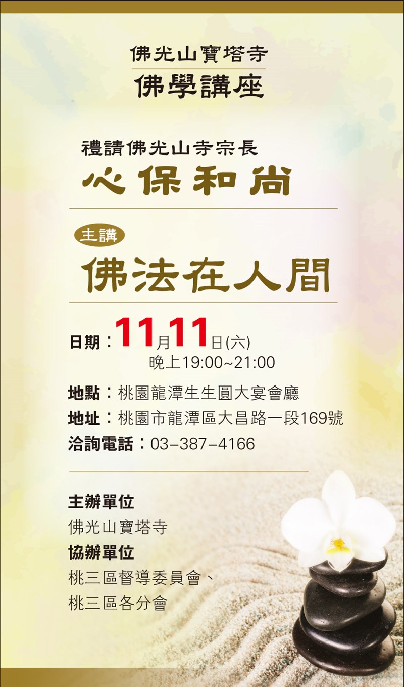 佛光山寶塔寺佛學講座 |2017.10.25 語音朗讀 1229觀看次 字級 大 中 小 佛光山寶塔寺佛學講座 日期:11月11日(六)晚上19:00~21:00 地點:桃園龍潭生生圓大宴會廳 地址:桃園市龍潭區大昌路一段169號 洽詢電話:03-387-4166 前一篇文章 佛光山叢林學院招生 下一篇文章 佛館自在專賣品 推出 純手感綿布《一筆字布書衣》 熱門新聞 01水晶物理性 與化學性質2026.03.1702新竹.尖石 群峰疊翠山色佳 泰雅歌聲伴霧霞2026.03.1603店貓上班摸魚睡翻 萌樣逗樂網友2026.03.1804越南大選 料共產黨壓倒性掌控2026.03.1605澎湖食農教育 向下扎根2026.03.1906大馬急轉彎 撤回美對等貿易協議無效說 2026.03.1807北美最乾燥加州死谷 罕見繁花錦簇2026.03.1808美海軍引進機器人 爬牆維修艦艇2026.03.1909【分享時刻】某些愛2026.03.1810菲律賓萬年寺 民眾自發迎請 展現弘法成果2026.03.19 訂閱電子報 台北市 天氣預報 台灣一週天氣預報 相關報導 以文字護持人間福報運動睡眠新科技 養生保健新利器房仲第一品牌 永慶加薪3% 體驗美好手作 製皂幸福時光 博愛社大春季班招生中 薩克斯風吹奏春季班 人間大學台中分校招生中 跨越十年縱橫南半球到北半球 《行者》新書上市