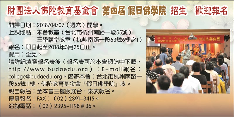 『假日佛學院』費用全免, 開課日期:2018/04/07,上課地點:本會教室(台北市杭州南路一段55號)及三學講堂教室(杭州南路一段63號6樓之1),報名:即日起至2018年3月25日止。報名表可於本會網站中下載,http://www.budaedu.org),各班的『教學計劃大綱』及授課講師資料,需要者可向本會請索;或參閱本會網頁。:洽詢電話:(02)2395-1198#36