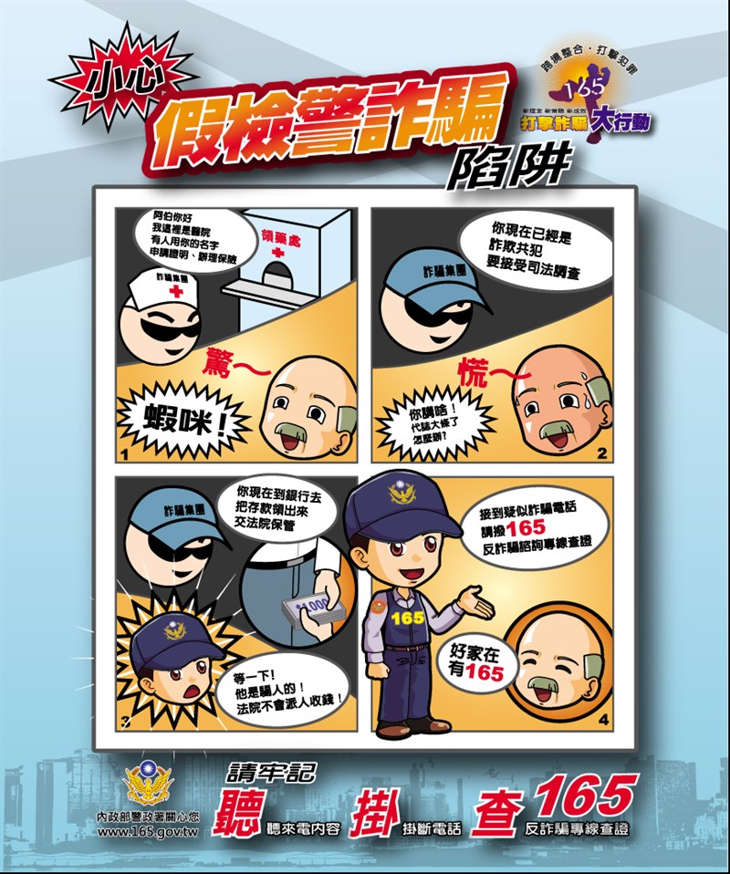小心假檢警詐騙陷阱 |2017.10.27 語音朗讀 629觀看次 字級 大 中 小 小心假檢警詐騙陷阱 請牢記聽電話內容 掛斷電話 查反詐騙165專線查證 前一篇文章 資氧益 喝的氧氣 下一篇文章 訂閱福報送母校 熱門新聞 01水晶物理性 與化學性質2026.03.1702北美最乾燥加州死谷 罕見繁花錦簇2026.03.1803大馬急轉彎 撤回美對等貿易協議無效說 2026.03.1804店貓上班摸魚睡翻 萌樣逗樂網友2026.03.1805美海軍引進機器人 爬牆維修艦艇2026.03.1906【歷史點滴】走過百年 高雄橋頭糖廠2026.03.1807【大江南北】哈爾濱呼蘭天主教堂2026.03.1808【分享時刻】某些愛2026.03.1809澎湖食農教育 向下扎根2026.03.1910草間彌生作品 德國展出2026.03.18 訂閱電子報 台北市 天氣預報 台灣一週天氣預報 相關報導 以文字護持人間福報運動睡眠新科技 養生保健新利器房仲第一品牌 永慶加薪3% 體驗美好手作 製皂幸福時光 博愛社大春季班招生中 薩克斯風吹奏春季班 人間大學台中分校招生中 跨越十年縱橫南半球到北半球 《行者》新書上市