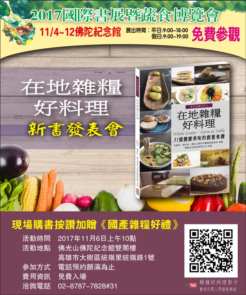 《在地雜糧好料理》新書發表會 |2017.10.29 語音朗讀 392觀看次 字級 大 中 小 《在地雜糧好料理》新書發表會 配合國產雜糧的推廣,由福報文化精心規劃的新書《在地雜糧好料理》,邀請作者現場製作雜糧料理與大家分享,本書裡面有小農種雜糧的溫度故事,及51道雜糧食譜等精彩內容,歡迎大家來參加,展覽期間到國產雜糧主題區(V31)現場買書,再加贈國產雜糧好禮,送完為止。 活動時間:2017年11月6日上午10點 活動地點:佛光山佛陀紀念館雙閣樓 高雄市大樹區統嶺里統嶺路1號 報名方式:電話預約額滿為止 費用資訊:入場免費 洽詢電話:02-8787-7828-31 前一篇文章 佛光山叢林學院招生 下一篇文章 板橋講堂佛學講座 熱門新聞 01水晶物理性 與化學性質2026.03.1702大馬急轉彎 撤回美對等貿易協議無效說 2026.03.1803店貓上班摸魚睡翻 萌樣逗樂網友2026.03.1804【歷史點滴】走過百年 高雄橋頭糖廠2026.03.1805北美最乾燥加州死谷 罕見繁花錦簇2026.03.1806【大江南北】哈爾濱呼蘭天主教堂2026.03.1807【分享時刻】某些愛2026.03.1808草間彌生作品 德國展出2026.03.1809美海軍引進機器人 爬牆維修艦艇2026.03.1910WBC委內瑞拉首闖決賽 今與美爭冠2026.03.18 訂閱電子報 台北市 天氣預報 台灣一週天氣預報 相關報導 以文字護持人間福報運動睡眠新科技 養生保健新利器房仲第一品牌 永慶加薪3% 體驗美好手作 製皂幸福時光 博愛社大春季班招生中 薩克斯風吹奏春季班 人間大學台中分校招生中 跨越十年縱橫南半球到北半球 《行者》新書上市