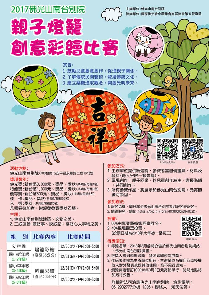 2017佛光山南台別院親子燈籠彩繪比賽 |2017.11.03 語音朗讀 1395觀看次 字級 大 中 小 2017佛光山南台別院親子燈籠彩繪比賽 現場專業藝術家指導 獎金獎品獎狀等待贏取 免費報名參加 未報名者快至南台別院報名參加, 或上網址:https://goo.gl/forms/Rf3T9p8duGGkdTzj2 報名。 前一篇文章 2017國際書展暨蔬食博覽會 下一篇文章 那些年我們推廣的報紙 熱門新聞 01HBL周末總決賽 8校燃戰火 2026.03.2002川普估習川會 5或6周內舉行2026.03.1903澳洲南天寺 南半球續法燈 人間佛教落地生根2026.03.1904美海軍引進機器人 爬牆維修艦艇2026.03.1905返鄉火車擠爆2026.03.2006佛光大學 語文、歷史學系全部滿招2026.03.1907【愛的關鍵字】愈親近,愈容易失控?2026.03.1908佛光祖庭宜興大覺寺 佛法薪傳歸故里 悲願光照人間2026.03.1909噴火龍奇多餅乾 280萬拍出創紀錄2026.03.1910澎湖食農教育 向下扎根2026.03.19 訂閱電子報 台北市 天氣預報 台灣一週天氣預報 相關報導 以文字護持人間福報運動睡眠新科技 養生保健新利器房仲第一品牌 永慶加薪3% 體驗美好手作 製皂幸福時光 博愛社大春季班招生中 薩克斯風吹奏春季班 人間大學台中分校招生中 跨越十年縱橫南半球到北半球 《行者》新書上市