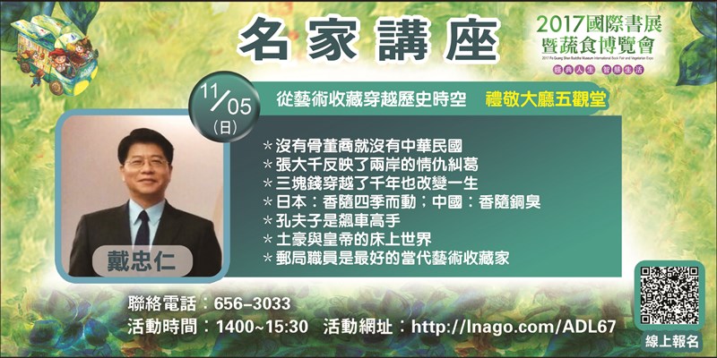 2017國際書展記蔬食博覽會名家講座 |2017.11.05 語音朗讀 668觀看次 字級 大 中 小 2017國際書展記蔬食博覽會名家講座 11月5日(日)戴忠仁主講:從藝術收藏穿越歷史時空 活動時間:14:00~15:30 前一篇文章 《在地雜糧好料理》新書發表會 下一篇文章 大師全集365冊 歡迎隨喜助印 熱門新聞 01HBL周末總決賽 8校燃戰火 2026.03.2002川普估習川會 5或6周內舉行2026.03.1903澳洲南天寺 南半球續法燈 人間佛教落地生根2026.03.1904【島嶼拼圖】時光站牌2026.03.1905佛光祖庭宜興大覺寺 佛法薪傳歸故里 悲願光照人間2026.03.1906美海軍引進機器人 爬牆維修艦艇2026.03.1907返鄉火車擠爆2026.03.2008【詩】蠟蟬說禪2026.03.1909中南部大旱 高雄3月已73件山林火警 2026.03.2110佛光大學 語文、歷史學系全部滿招2026.03.19 訂閱電子報 台北市 天氣預報 台灣一週天氣預報 相關報導 以文字護持人間福報運動睡眠新科技 養生保健新利器房仲第一品牌 永慶加薪3% 體驗美好手作 製皂幸福時光 博愛社大春季班招生中 薩克斯風吹奏春季班 人間大學台中分校招生中 跨越十年縱橫南半球到北半球 《行者》新書上市