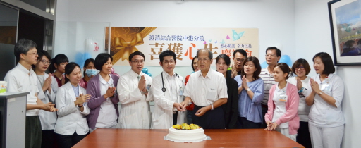 澄清醫院醫護團隊為吳姓市民喜獲心生,一起切蛋糕慶祝。圖/取自網路