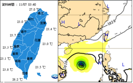 台北在今晨溫度27度,比昨天高4度(左圖);周六熱帶擾動已通過菲律賓,進入南海,有機會發展成第24號颱風(右圖)。圖/取自網路