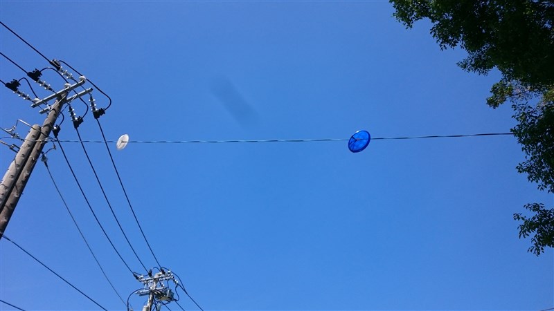 花蓮玉里鎮經常有松鼠在空中的電線 上遊走,曾兩度造成跳電影響住戶用電安全。台電公司最近在電線上高掛「路障」阻絕,成為特殊街景。圖/取自網路