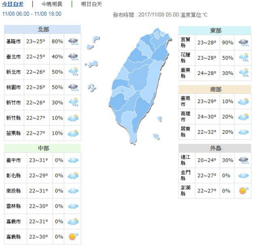 今天東北風增強,新竹以北及東半部雲量增多,並有局部短暫雨。圖/取自網路