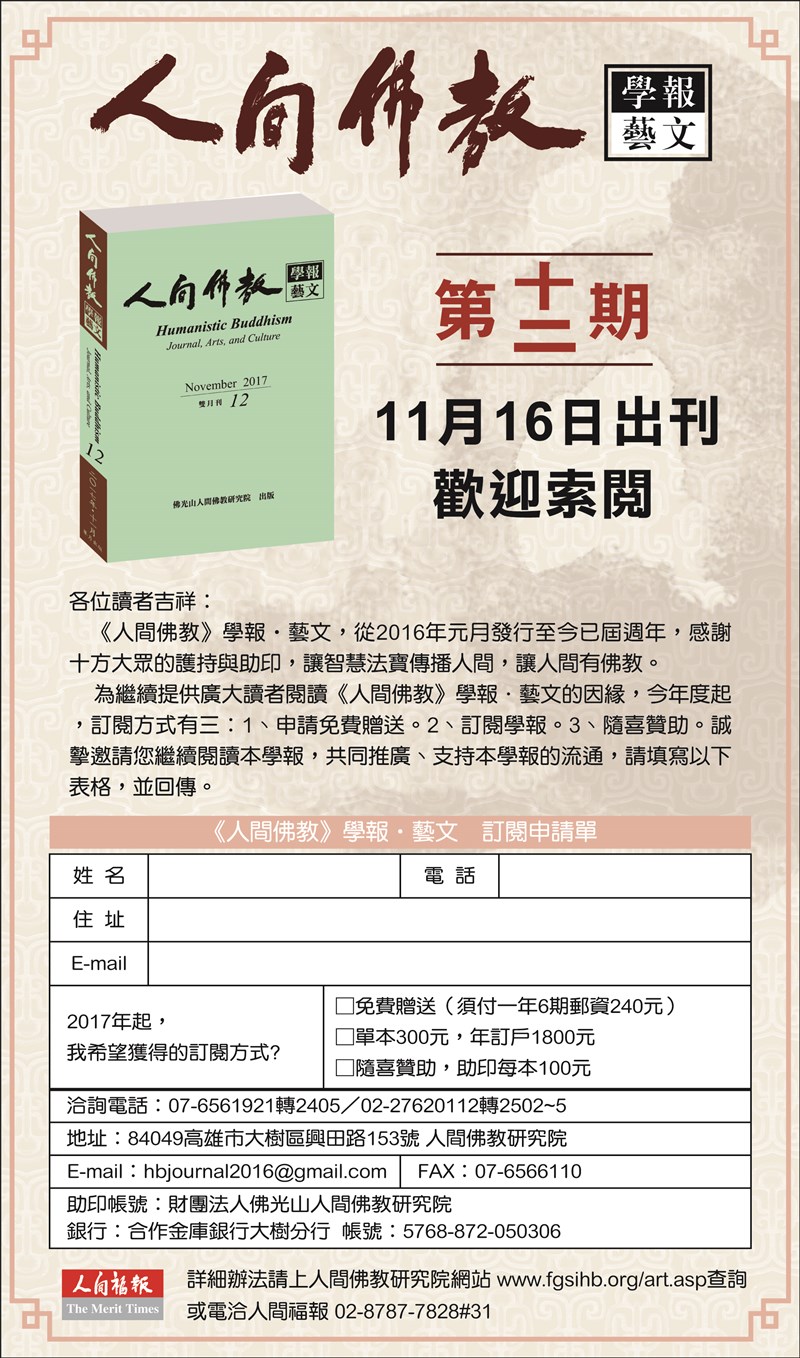 索取《人間佛教學報‧藝文》 |2017.11.14 語音朗讀 634觀看次 字級 大 中 小 索取《人間佛教學報‧藝文》第十二期 詳細辦法請上人間佛教研究院網站www.fgsihb.org/art.asp查詢 前一篇文章 曹爺推廣養生系列商品 下一篇文章 美蔘 無糖人參黑木耳露 熱門新聞 01南華大學茶禪雅集 靜坐書寫時光膠囊2026.03.2602星雲大師靈骨分燈歐洲 傳燈萬方2026.03.2603佛光山365日越文版 贈西貢日航大酒店2026.03.2704【詩】白花鬼2026.03.2505紅綠葡萄抗氧化抗發炎 連皮吃獲取健康全效益2026.03.2706台灣工藝3專書 呈現文化獨特樣貌2026.03.2707中職37年 明大巨蛋開幕戰2026.03.2708兒童節禮物 新北學生自己票選2026.03.2609北京中學老師 精準預言美伊開戰2026.03.2610伊朗設安全走廊 陸船復航荷莫茲2026.03.25 訂閱電子報 台北市 天氣預報 台灣一週天氣預報 相關報導 以文字護持人間福報運動睡眠新科技 養生保健新利器房仲第一品牌 永慶加薪3% 體驗美好手作 製皂幸福時光 博愛社大春季班招生中 薩克斯風吹奏春季班 人間大學台中分校招生中 跨越十年縱橫南半球到北半球 《行者》新書上市