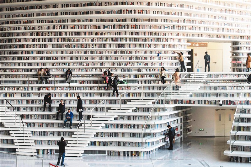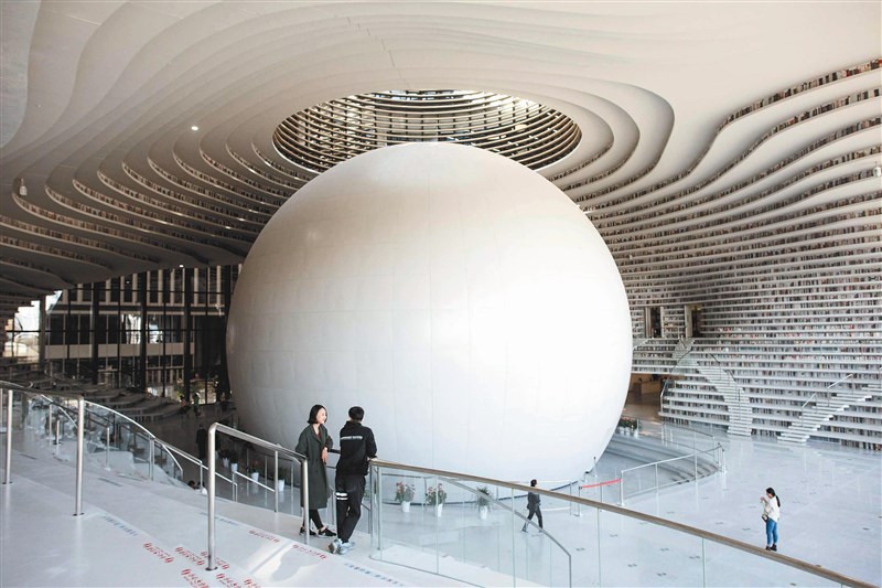 近日天津一座圖書館以別緻的造型在網絡走紅,圖書館位於天津濱海文化中心,總建築面積三萬三千七百平方公尺,建築層數為六層,藏書總量達一百二十萬冊。圖書館中心有一個直徑二十多公尺的白色球形報告廳,球體表面由鋁合金穿孔板背襯LED燈構成,像一個明亮的眼睛注視著濱海。