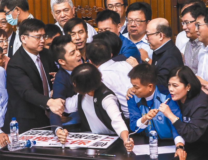 日前針對「勞基法」部分條文修正草案時,國民黨立院黨團企圖占領主席台,民進黨立即甲級動員,雙方一度拉扯衝突。國民黨蔣萬安(左二)露出痛苦表情。圖╲鄭清元