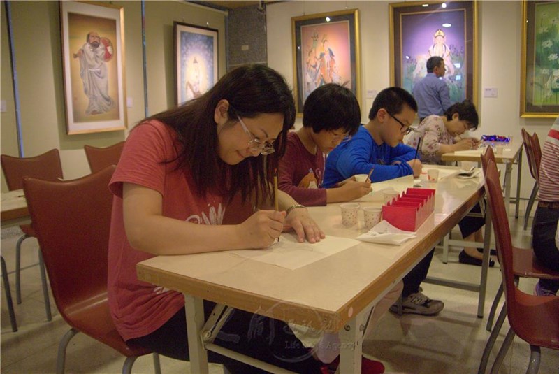 佛光緣美術館彰化館近期展出「善緣十方 謝淑美佛畫展」,邀請彰化社區大學佛畫班老師謝淑美導覽作品,傳授畫蓮的工筆技巧與彩繪藝術。他的佛畫作品線條工整、細膩、嚴謹,色彩則展現出艷麗、沉著、明快、素雅,相當具有濃郁的色彩與審美意趣。