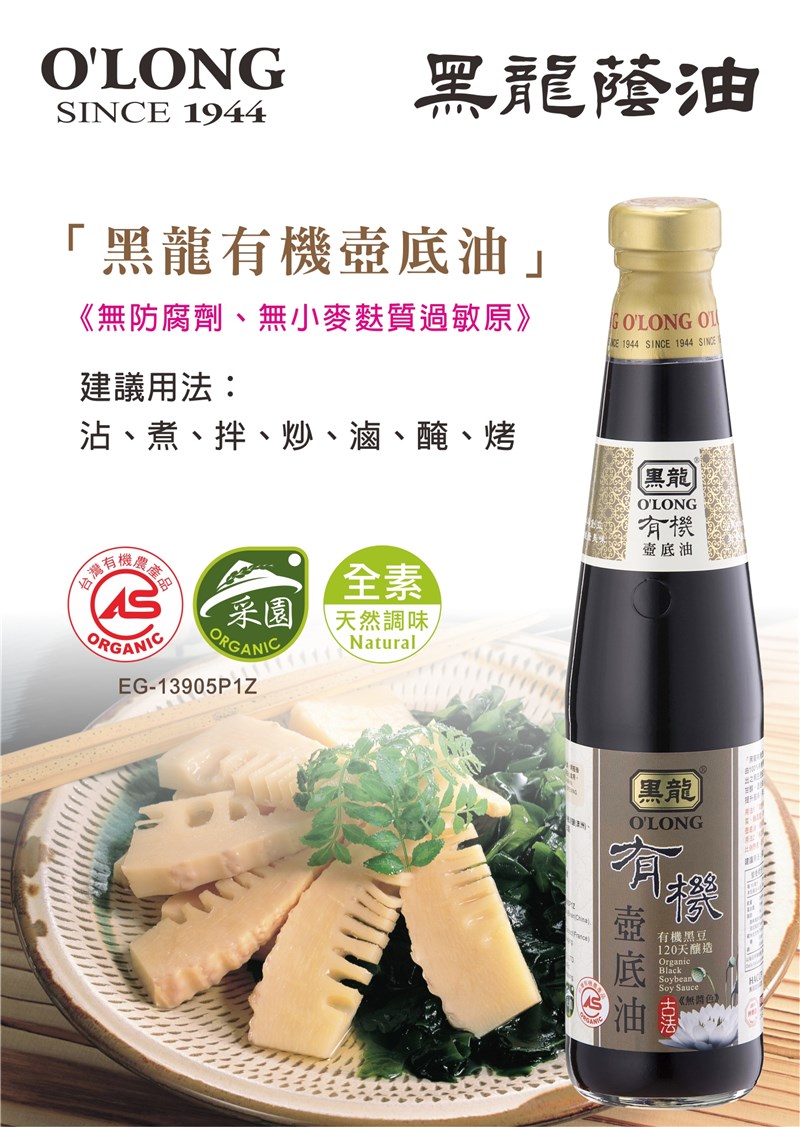 黑龍有機壺底油,由100%有機黑豆釀製的高品質黑豆蔭油,可使料理愈滷煮愈香、味道更甘醇美味,無防腐劑、無小麥麩質過敏原,適合「沾、拌、滷、煮、烤、蒸、醃、湯底、調製醬汁」,用法方便多元,延續傳統古早風味。 黑龍蔭油於2015年起開辦黑龍盃烹飪比賽,得到青年學子們的熱烈迴響,今年決賽將在12月2日於稻江科技暨管理學院隆重登場,邀請您一同為參賽者加油。