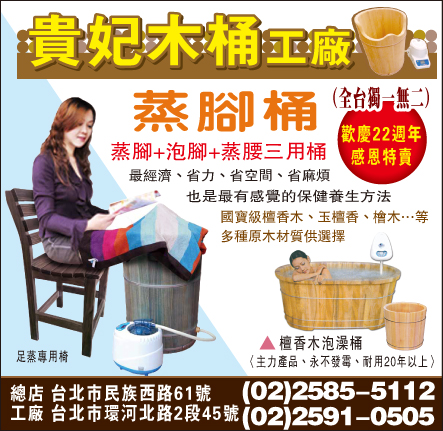 貴妃木桶產品材質主要採用國寶級檀香木、玉檀香、或台灣檜木等天然木材製成,富含大量芬多精,檀香木因木質密度特高,具有不長黑斑、不發霉特性,又有濃郁的檀香氣,使用年限可長達20年以上,廠系列產品包括各式泡澡桶、家庭式三溫暖蒸烤箱及蒸腳桶、泡腳桶,桶內有按摩輪腳踏座,可在足蒸時同時按摩腳底,提供居家或飯店業者使用。款式多元,尺寸齊全,自產自銷,品質有保障,可量身訂做。公司為工廠直營,歡慶22周年感恩特賣,歡迎親臨現場參觀選購。