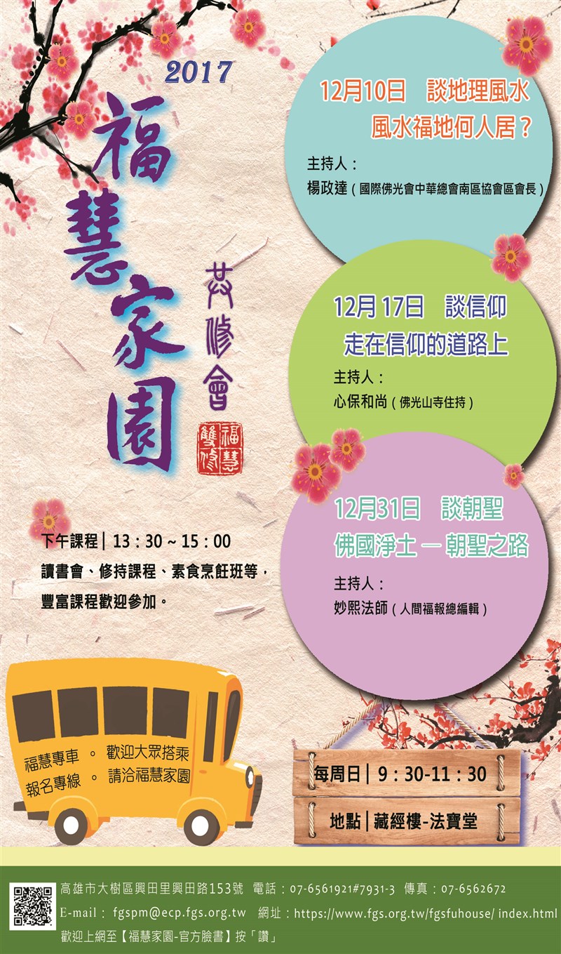 福慧家園共修會 |2017.11.21 語音朗讀 483觀看次 字級 大 中 小 福慧家園共修會 12月10日談地理風水 12月17日談信仰 12月31日談朝聖 時間:每周日9:30~11:30 地點:佛光山藏經樓-法寶堂 下午課程13:30~15:00人間佛教講座、素食烹飪班等,豐富課程歡迎參與。 前一篇文章 靈骨塔投資新詐騙手法 下一篇文章 柏克Farabloc 醫療復建系列 熱門新聞 01佛光山月光寺啟用 花蓮心靈新地標2026.03.2902推動科學辦案 鑑識權威李昌鈺87歲辭世2026.03.2903道奇頒冠軍戒 大谷喊要更多枚2026.03.2904中職開幕戰 猿隊險勝兄弟2026.03.2905川普誇耀政績 陸採購大豆倍增2026.03.2906最大規模無王日 逾3200場反川示威2026.03.3007汽油飆漲 1.7 元 創 11 年半新高2026.03.2908宜蘭綠博會 探索真理2026.03.3009陸首都維安 北京全面管制無人機2026.03.3010MLB 鄧愷威轉隊太空人 初登板奪首勝2026.03.30 訂閱電子報 台北市 天氣預報 台灣一週天氣預報 相關報導 以文字護持人間福報運動睡眠新科技 養生保健新利器房仲第一品牌 永慶加薪3% 體驗美好手作 製皂幸福時光 博愛社大春季班招生中 薩克斯風吹奏春季班 人間大學台中分校招生中 跨越十年縱橫南半球到北半球 《行者》新書上市