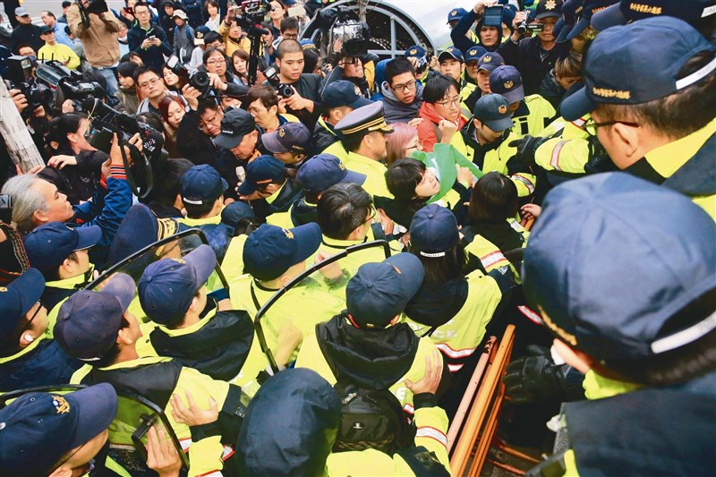 抗爭民眾在立法院大門試圖翻牆闖入,遭優勢警力阻擋,雙方發生推擠衝突。圖/林伯東