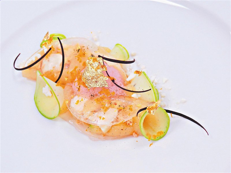 另一位得獎學生簡沛真,她的作品「蘋果樂園」,則把香檳果凍做到約零點二公分「薄如水餃皮」,包覆著青蘋果卡士達、蘋果丁蜜糖、鳳梨凍、蛋白餅與鮮奶油,表面灑些金箔,以青蘋果脆薄片做成花瓣裝飾,讓法國評審吃到台灣水果,咬下去還有酸甜、冰涼的口感層次。