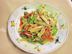 蘆筍三○○克、紅黃椒各半粒、薑片二○克、素火腿五○克、生香菇數朵。