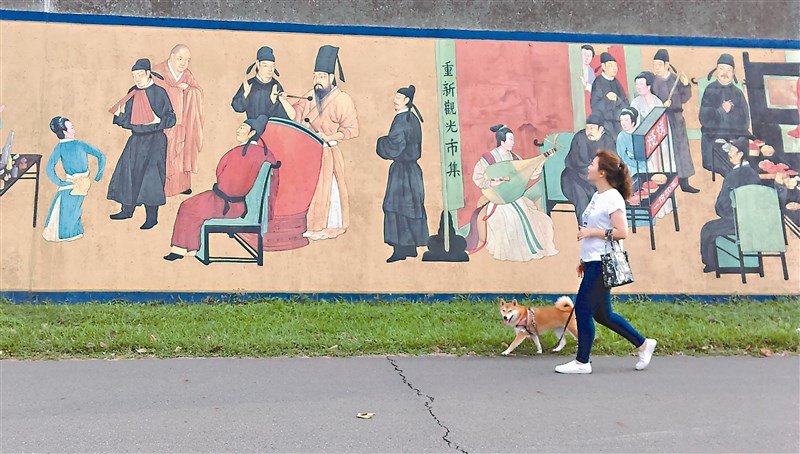 【本報新北訊】新北市高難地工程管理處去年在華江河濱公園堤防上完成〈新北上河圖〉,今年則集結中國十大名畫,打造完成長達十五幅圖、六百公尺的河堤藝廊,十分壯觀。