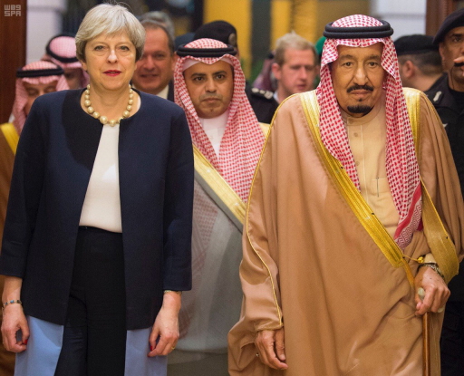 英國首相梅伊(左)29日會晤沙烏地阿拉伯國王沙爾曼(右)。圖/美聯社