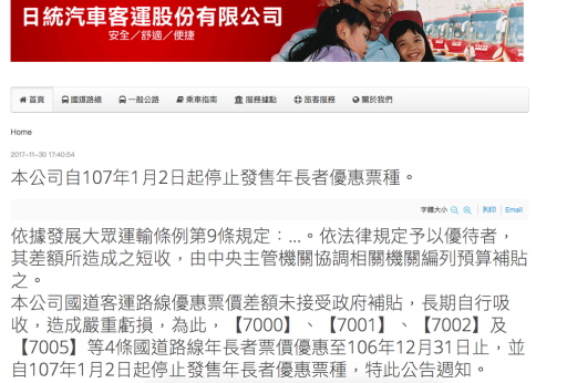 日統客運昨天在網路公告明年1/2起停賣敬老票。圖/取自網路