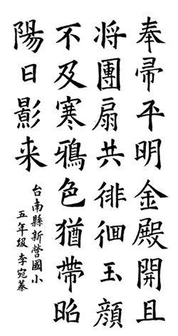 《小小書法家》 |2007.05.25 語音朗讀 648觀看次 字級 大 中 小 ▲高雄縣五林國小六年忠班 凌德穎▲台南縣新營國小五年級 李宛蓁 前一篇文章 《小豬仔》 下一篇文章 《走訪山海史蹟》文昌帝君 祝君金榜題名 熱門新聞 01【詩】草螟公2025.12.1802與精品品牌撞鞋 印度涼鞋打專利戰2025.12.2103福建艦航經台海 空拍照首曝光2025.12.1804資助流浪漢之家 里斯本佛光人跨文化送暖2025.12.1805多倫多佛光山龍獅團 中華文化薪火相傳2025.12.1806佛光山高雄佛教堂 營建工地評鑑特優2025.12.1907【時光重逢】花宅海邊美術館2025.12.1908邂逅佛教 安頓身心2025.12.2109北島佛光山獲四星肯定 園林躍升具重要意義庭園2025.12.1910太陽瓶燈泡 點亮貧困家庭希望 2025.12.19 訂閱電子報 台北市 天氣預報 台灣一週天氣預報 相關報導 寶寶成長禮 抓周做公益聆聽受傷的童年 北市家防中心推兒少保護展支持18歲公民權 家扶:更符公平正義影音/可愛童音 我還在咳嗽 幫我請假啦影音/天生善良 小女孩哭:我不要吃動物吃什麼都癢?如何減少嬰兒食物過敏