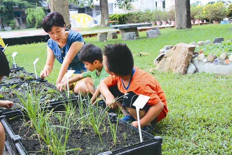 復興國小是偏鄉迷你小學,全校才六班、共四十三名小朋友,這學年獲得縣府補助三萬元,員林南區扶輪社社長蔡篤龍得知學校要推食農教育,邀社友捐款六萬元支持學校。三年級班長張淵鋐等八名同學,決定種香菜,老師帶領他們每天早上澆水(圖/復興國小提供),下課就到菜園抓害蟲,最近採收以六千元被認購。