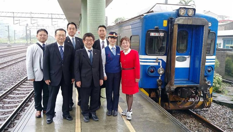 日本千葉縣銚子市市長越川信一(中),昨天率領友善訪問團共8人拜訪蘇澳鎮公所與蘇澳火車站,在火車頭前合照。圖/台鐵提供