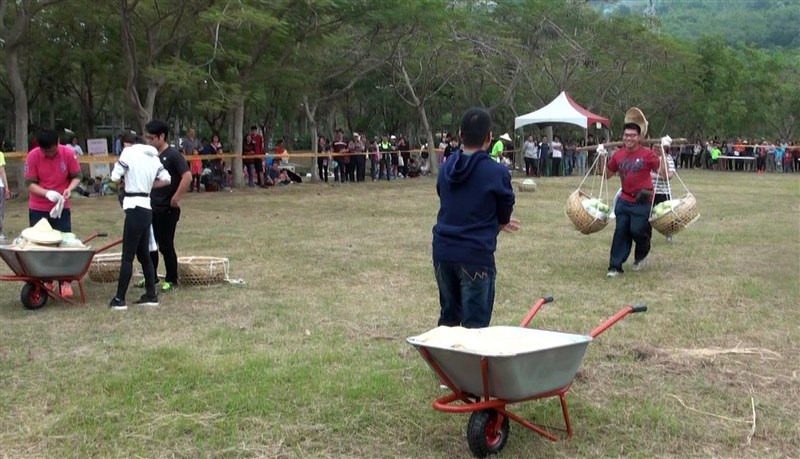 許多年輕人甚少接觸農活,扛起扁擔手忙腳亂,不是掉斗笠就是掉芭樂,但壯年組做起來氣定神閒。參賽的曹俊青說,阿嬤也種芭樂,不過這是他第一次捆稻草,覺得超新鮮。